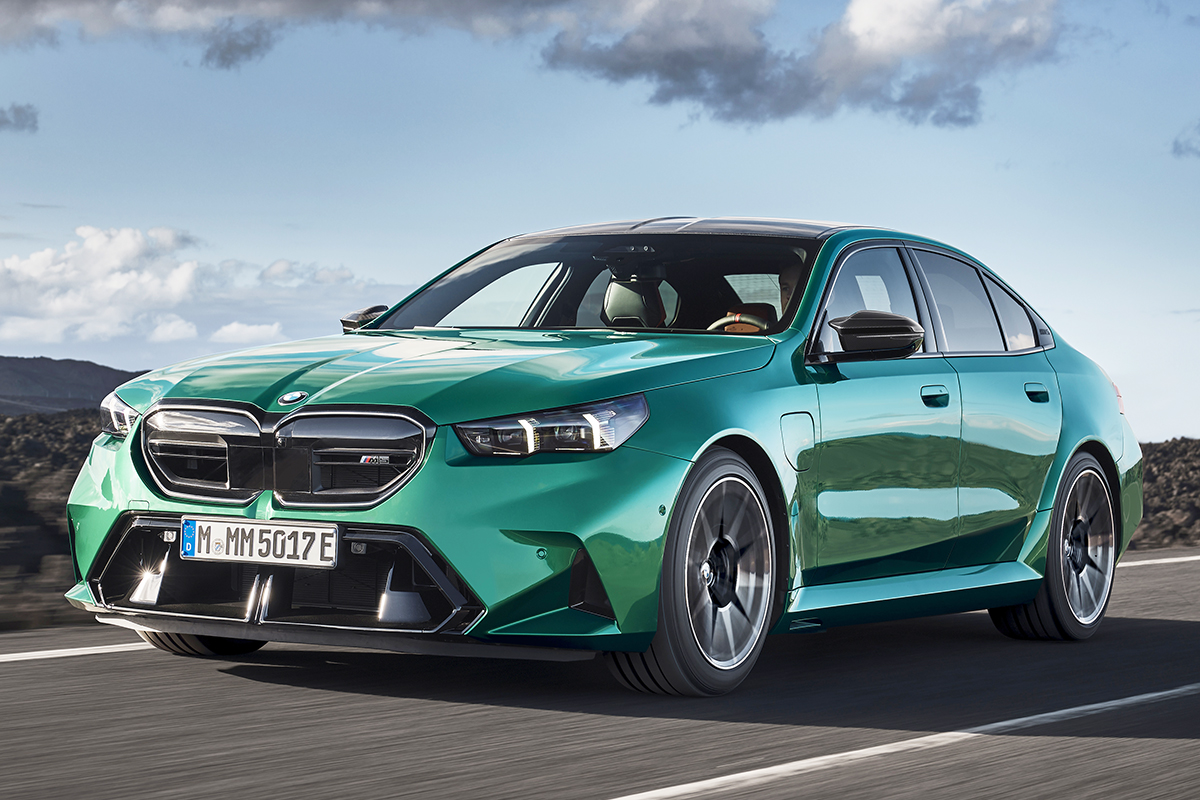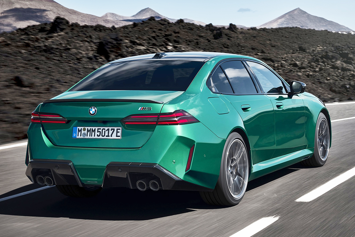 Yeni BMW M5 plug-in hybrid’in etkileyici M HYBRID güç ünitesini tamamlayan dış tasarımı, geniş çamurluk ağızları, 20 ve 21 inç boyutundaki ön ve arka jantlar M otomobillerine özgü dört çıkışlı egzoz sistemi ve C sütununda yer alan kabartmalı M5 logolu Hofmeister kıvrımı detaylarıyla tanımlanıyor.