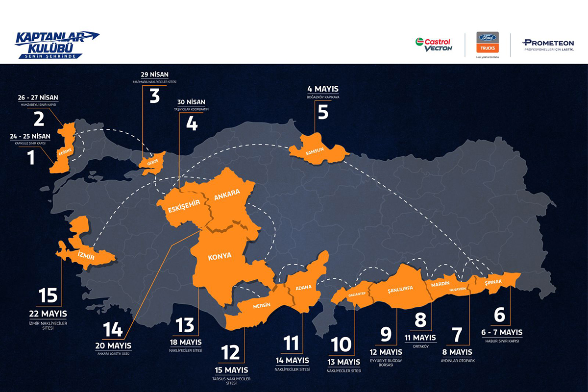 Ford Trucks, Castrol ve Prometeon’un hayata geçirdiği “Kaptanlar Kulübü Senin Şehrinde” etkinliğinin detaylı takvimine göre roadshow 24 Nisan’da Edirne Kapıkule Sınır Kapısı’nda başlayacak ve 22 Mayıs’ta İzmir Nakliyeciler Sitesi’nde sona erecek.