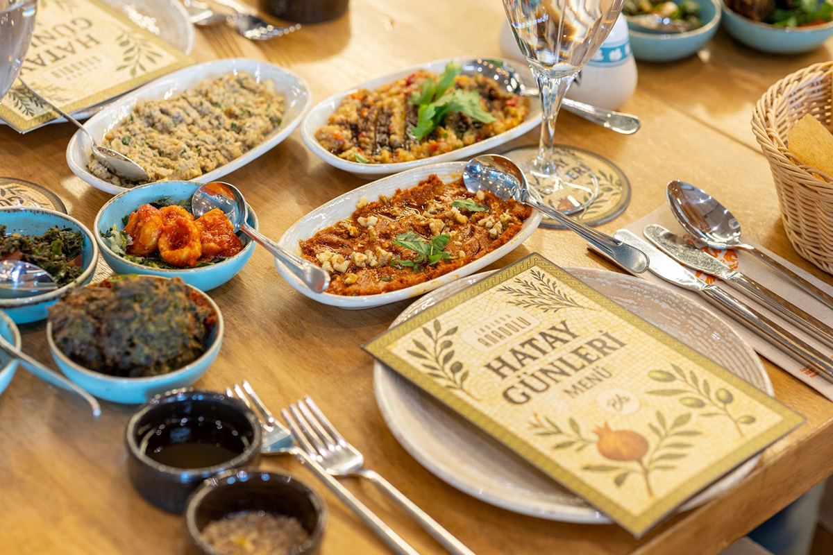 Misafirlere sunulan menüde Altınözü zeytinyağı, zahter, oruk ve kaytaz böreği eşliğinde yoğurt aşı, zahter salatası, cevizli biber, tahinli tarator, biberli ekmek, öcce, tuzlu yoğurtlu lahana sarma, Belen tava, Hatay usulü kireçte kabak ve daha birçok yöresel lezzet yer alıyor. Etkinlik menüsündeki tüm ürünler beşi kadın kooperatifi olmak üzere toplam 10 farklı Hataylı yerel üreticilerden tedarik ediliyor.